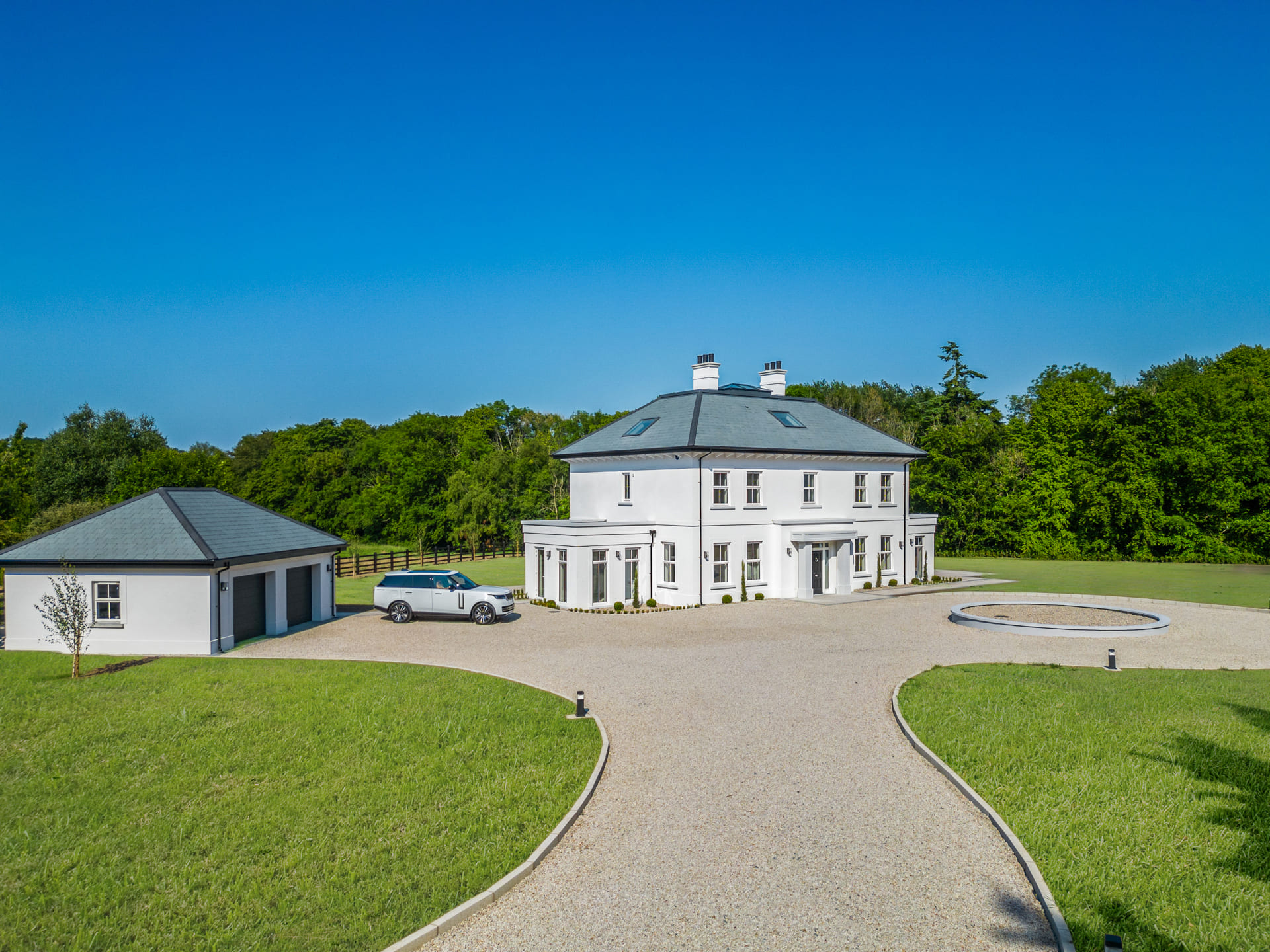 This contemporary country home is set within magnificent grounds of circa 1.75 acres and is approached via electric gates and a sweeping private driveway. The cleverly designed architecture boasts generously proportioned rooms throughout, with an emphasis on natural light and entertaining space. Stone pillars frame the smart front entrance, which opens to an impressive reception hall with an elegant staircase rising to the first floor. The principal reception rooms lead off from the hall, including an impressive drawing room with a large fireplace and views over the landscaped garden.